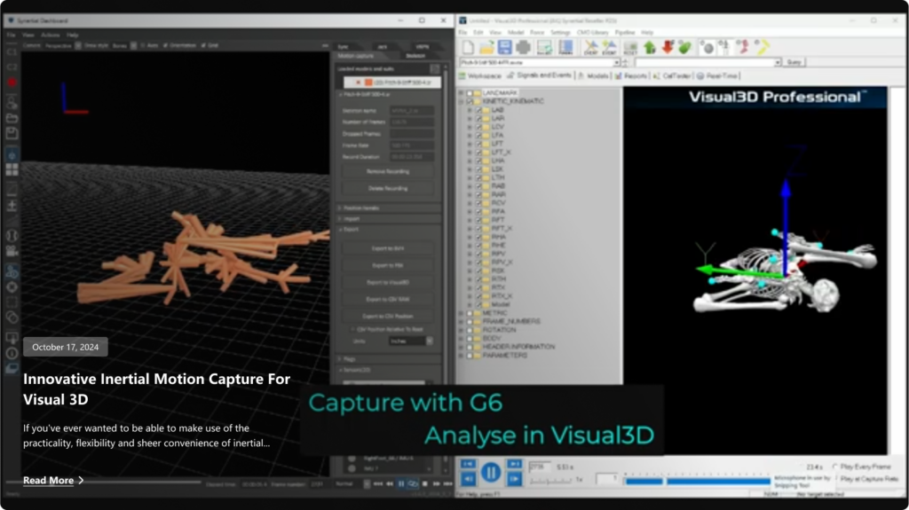 その結果:Visual3Dは、AIQ Synertialの画期的なG6範囲と完全に互換性があり、市場の真の代替品をもたらします。これは、バイオメカニクス作業で慣性モーションキャプチャシステムを選択している人にとって信頼できるアクセス可能なバイオメカニクスパイプラインです。